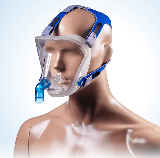 Das Kopfband aus elastischem Stoff ist mit einem 5-Punkt-Befestigungssystem und 2 Clips ausgestattet. Die Masken besitzen einen Zugang für Sonden, Katheter und Fibrobronchoskop und Trinkhalme. Für alle Masken lassen sich unterschiedliche Winkel-Konnektoren flexibel nach Bedarf auswechseln.